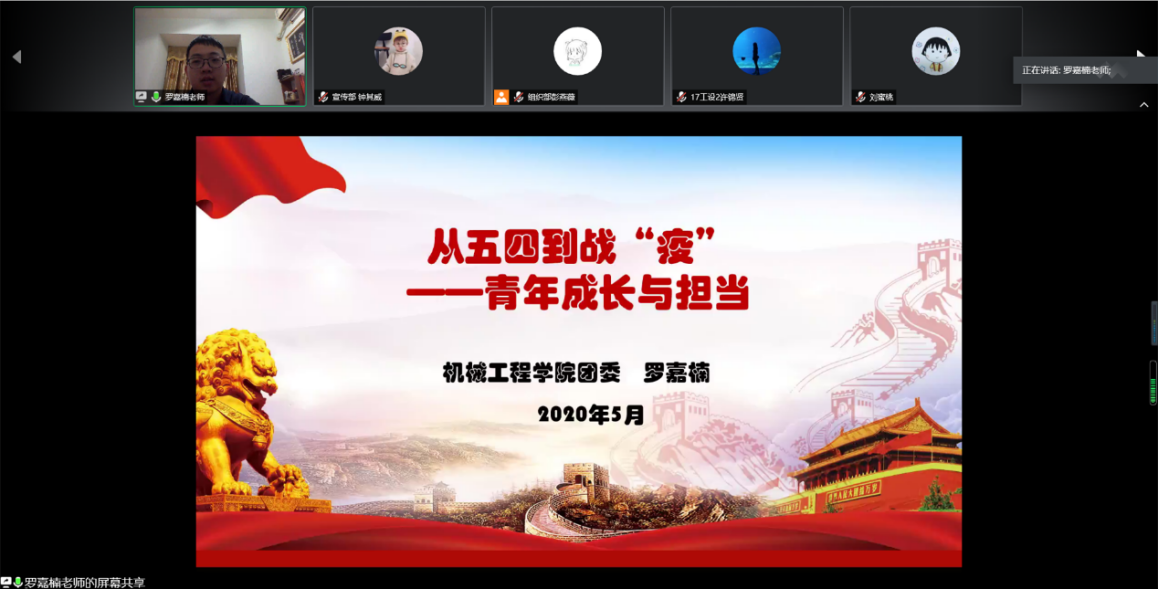机械工程学院团委面向团学组织学生干部举行了“弘扬五四精神,绽放战疫青春”主题团课,以五四运动切入,以共青团史、青年运动史为时间线索,围绕“新青年,初登场”、“青年大建设”、“新时代与伟大梦想”、“战役青春:青年使命与担当”等方面进行讲授。
