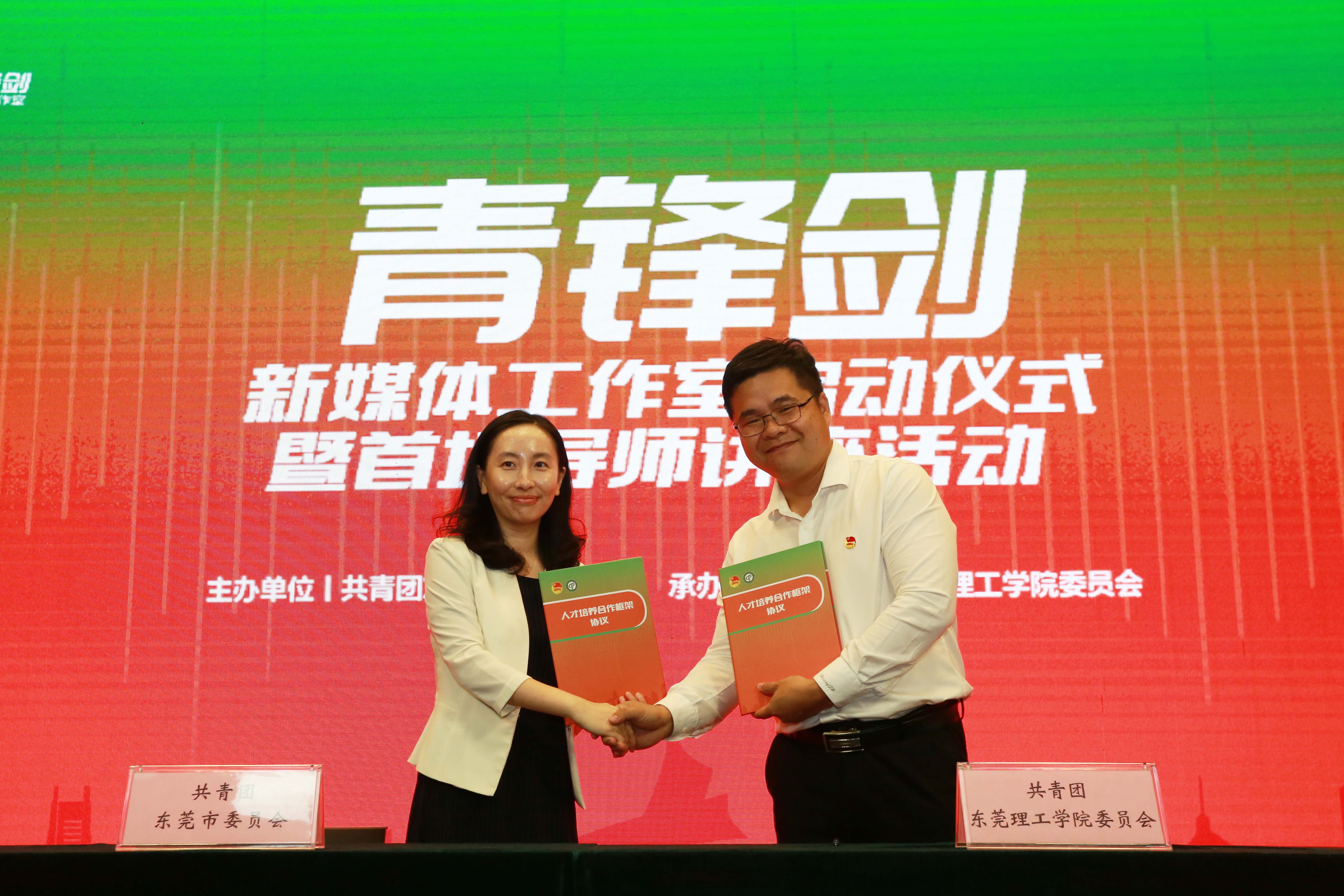 启动仪式上,张科为陈冀颁发青锋剑新媒体工作室荣誉导师证书,并为“东莞市青年讲师团”授旗。