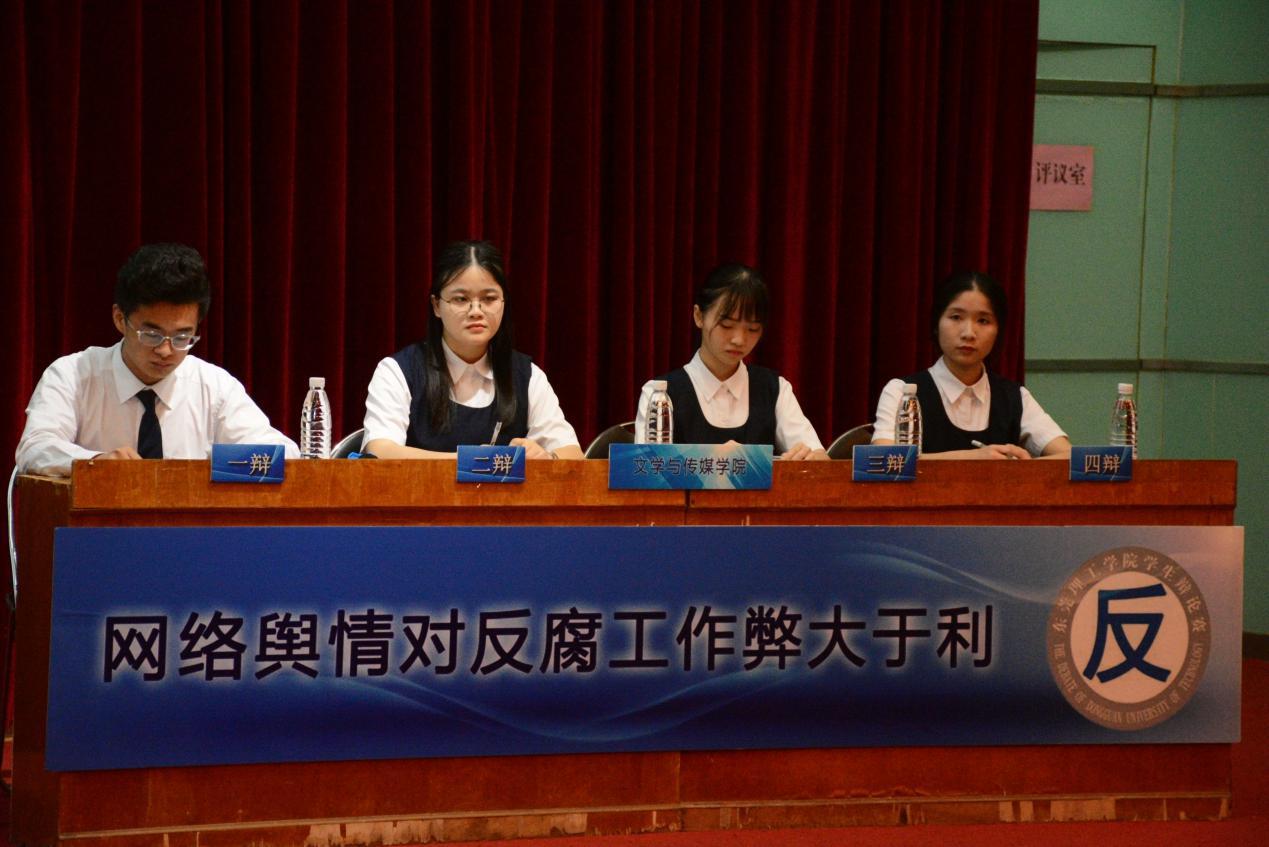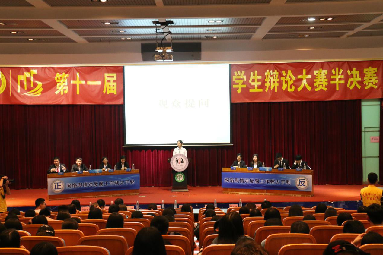 半决赛第一场辩论正反方分别是生态环境与建筑工程学院代表队和文学与传媒学院代表队,正方辩题为“网络舆情对反腐工作利大于弊”,反方辩题为“网络舆情对反腐工作弊大于利”。经过精彩激烈的辩论后,生态环境与建筑工程学院代表队得分为88分,文学与传媒学院代表队得分为85分。最终,生态环境与建筑工程学院代表获得第一场的胜利。此次大赛也诞生了优秀辩手和最佳风采奖得主,他们分别是正方三辩黄奕华和反方二辩钟筏童。