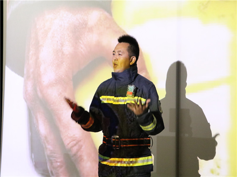 在接下来的知识讲座中,东莞市消防救援支队东城大队代表黎志成为同学们普及在校防火安全的相关知识,讲述火灾逃生的注意事项。随后文传团学全体成员带来朗诵表演,歌颂消防队员的高尚品德与奉献精神,表达了同学们对消防人员的敬佩与感谢。