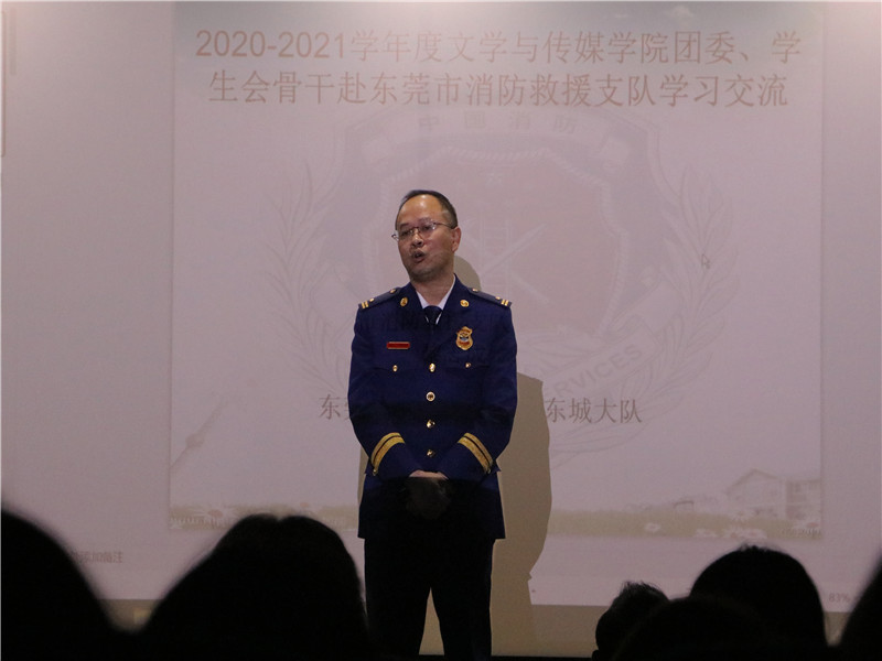 2020年12月3日14:00,文学与传媒学院团委书记海景龙带领文传团学全体成员赴东莞市消防救援支队学习交流。