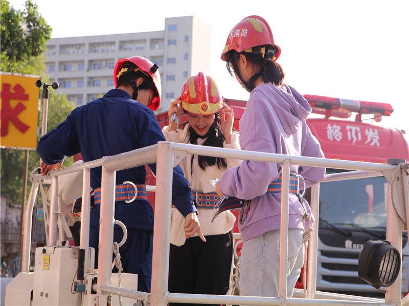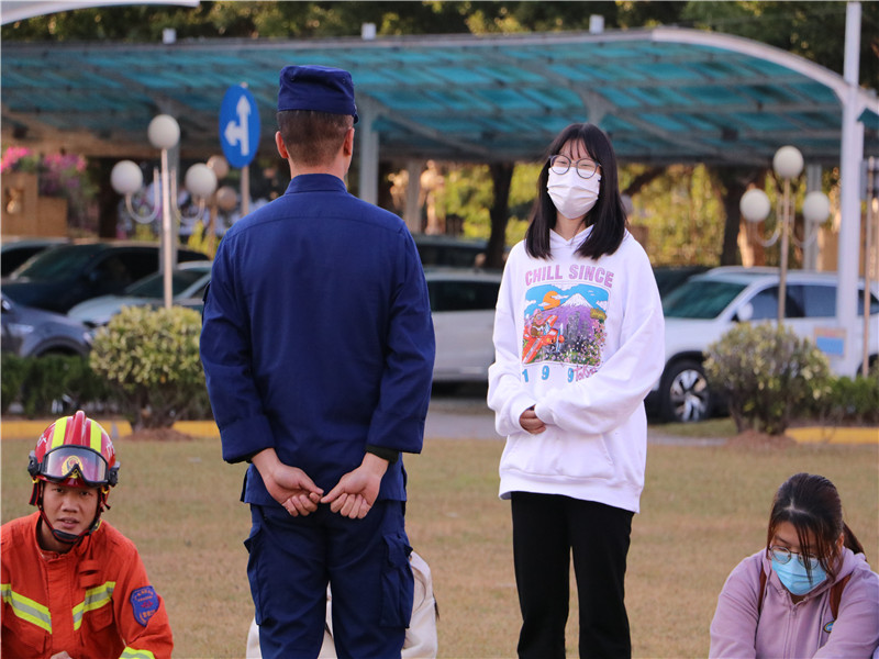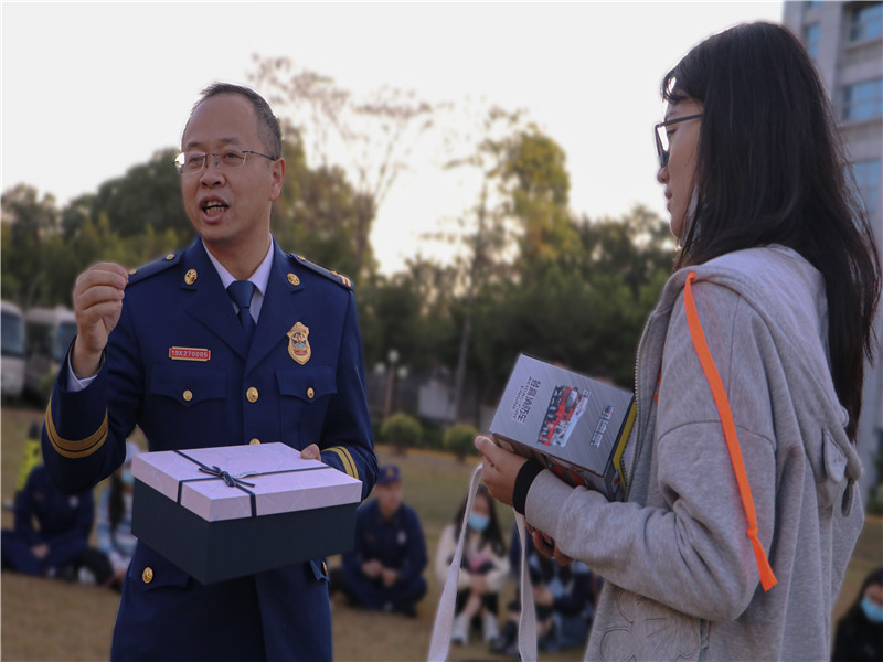 讲座结束后,东莞市消防救援支队政治部组织教育科科长邱名州向同学们介绍各类消防车的特点和适用场景。并带领同学们观看消防员日常训练内容,如模拟救助被困孩童、灭火演练、火场救援等等多项活动,同时带领同学参与救援云梯体验。随后,团学全体成员与消防队员围圈而坐并交流发言,同学们分享此次活动感受,与消防队员互相提问,氛围轻松愉悦。在活动的最后,团委书记海景龙发言总结:团学干部要通过此次交流,学习消防精神,严于律己,勇于担当,面对磨难能够勇往直前。最后,由学生会执行主席赖婷代表文传团学与东莞市消防救援支队互赠礼品。