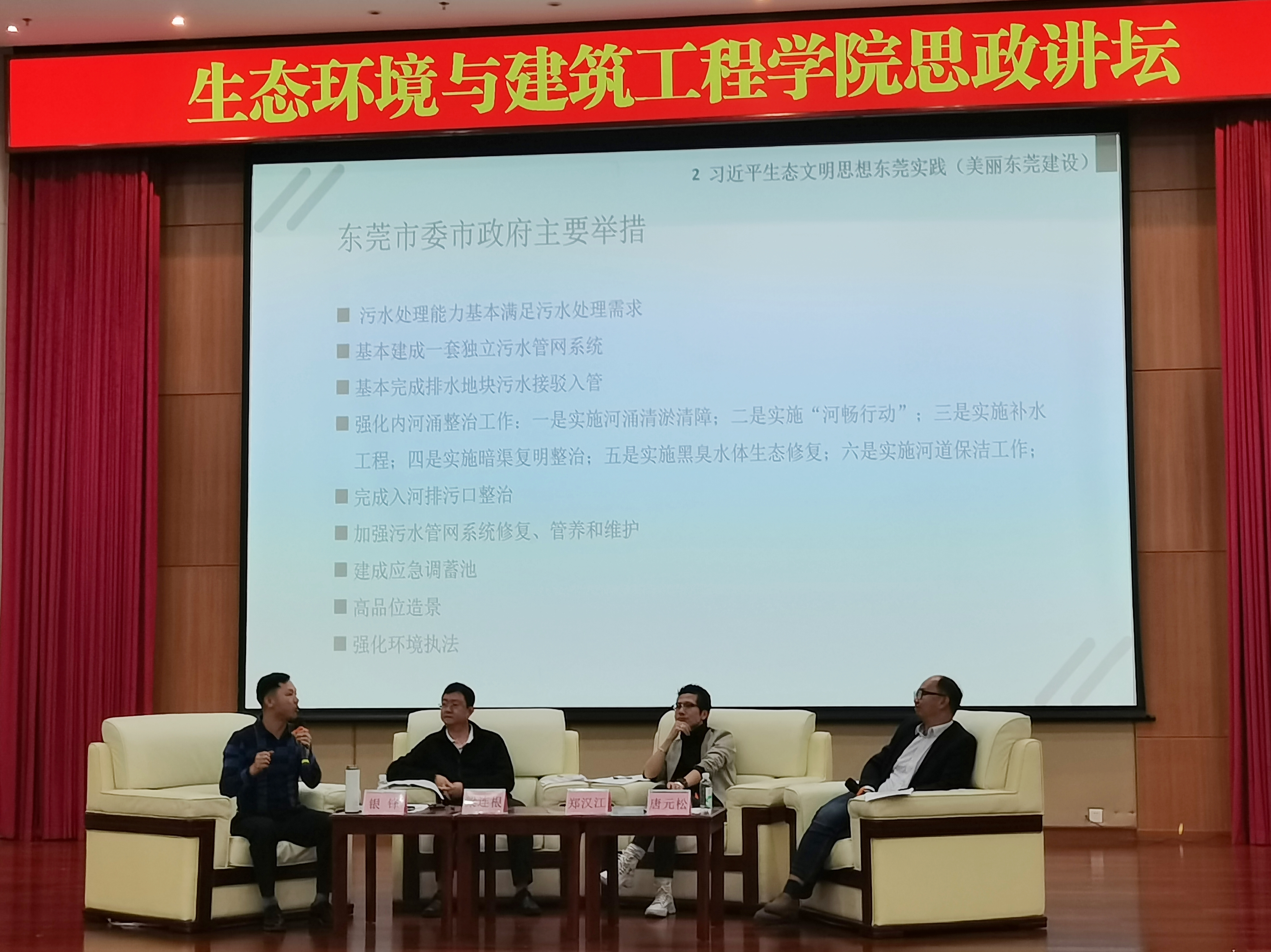 2020年12月2日晚,yl88858永利集团生态环境与建筑工程学院“思政讲坛”特邀马克思主义学院唐元松教授,银锋教授,和本院优秀校友梁连根,郑汉江于松山湖校区学术会议中心阶梯报告厅作题为“生态东莞——绿水青山就是金山银山”的专题讲座。环建学院师生近500人聆听此次讲座,讲座由环建学院20级辅导员雷菲老师主持。