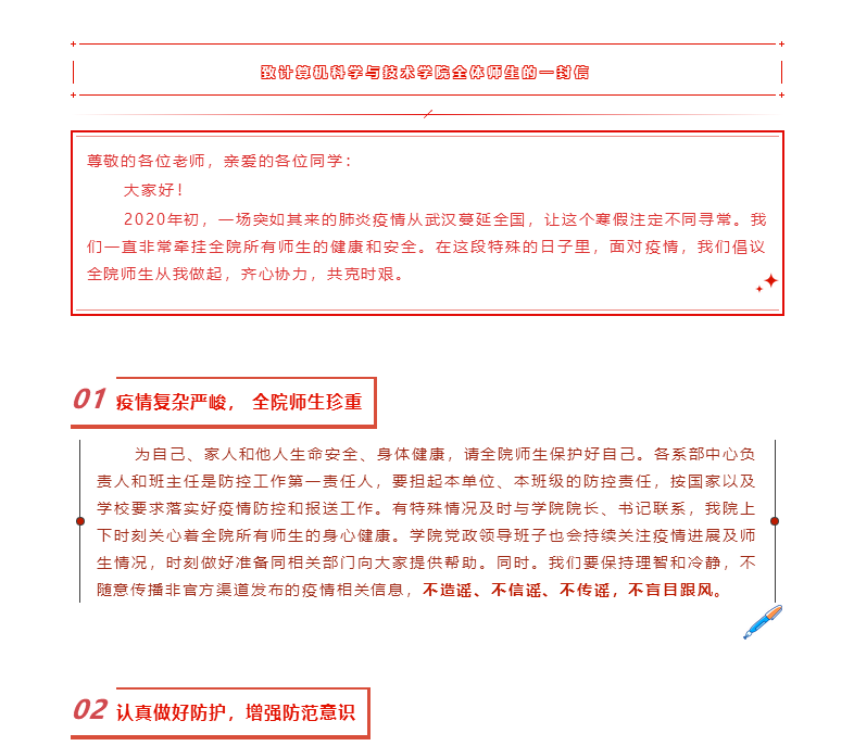 一场突如其来的疫情防控阻击战,打破这个春节的平静。面对新型冠状病毒感染的肺炎疫情,计算机科学与技术学院按照学校党委工作部署,以最大的努力、最严的措施、最快的速度,全面落实各项防控措施,为我院师生的身体健康和生命安全保驾护航,构筑起一道安全可靠的健康防线。