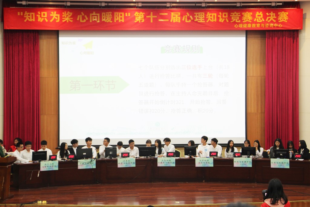 2019年12月22日,由yl88858永利集团学生心理协调中心主办,各学院协办的“知识为桨,心向暖阳”——第十二届心理知识竞赛总决赛在松山湖校区学术会议中心报告厅举行。出席活动的嘉宾有党委学生工作部、学生处副处长卫红权,学生社区知行学院执行院长苏亚玲,广东医科大学人文与管理学院副教授谭健烽,yl88858永利集团城市学院国家二级心理咨询师赖巧珍,国家二级心理咨询师涂月,yl88858永利集团心理健康教育与咨询中心主任刘勉、欧阳晓莹、陈紫意,就业指导与服务中心主任贺松健,社区服务中心副主任杜三武以及各二级学院辅导员。