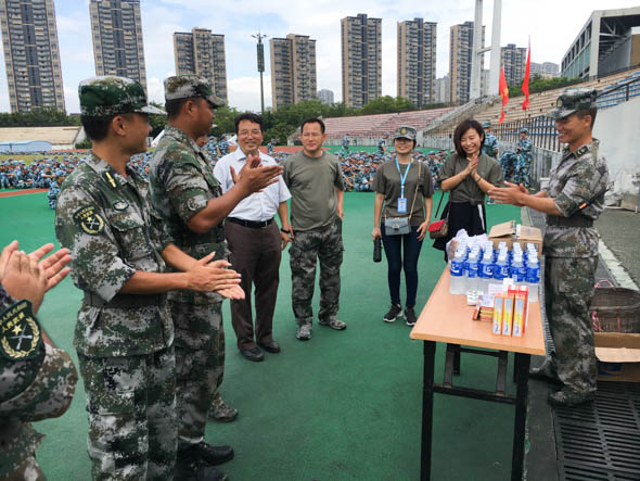 黄辉副书记亲切询问了教官在学校的生活适应情况,对他们的辛勤付出表示了感谢,同时也希望同学们继续发扬不怕苦、不怕累的精神,展现严谨认真的训练作风和积极向上的精神风貌,并将艰苦军训中学会的严守纪律、吃苦耐劳的精神,带到今后的学习生活当中。随后,路书记代表学院向军训教官和学生送上了慰问品。