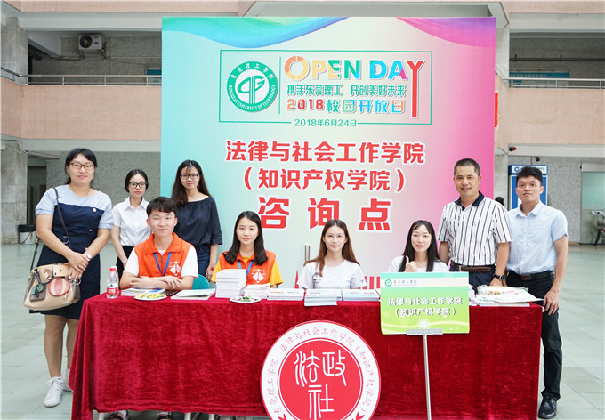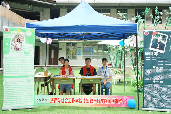 在5号楼、6号楼的学院接待点,工作人员向到访的考生和家长展示了学院在文化建设方面的成果,有党日活动剪辑、读书节作品集、法社学院纪念品大礼包等等。同时,高考考生和家长走进学院的办学场所模拟法庭和社会工作实验室,“零距离”感受法社学院的课程特色、教师风采和学生组织的活动。