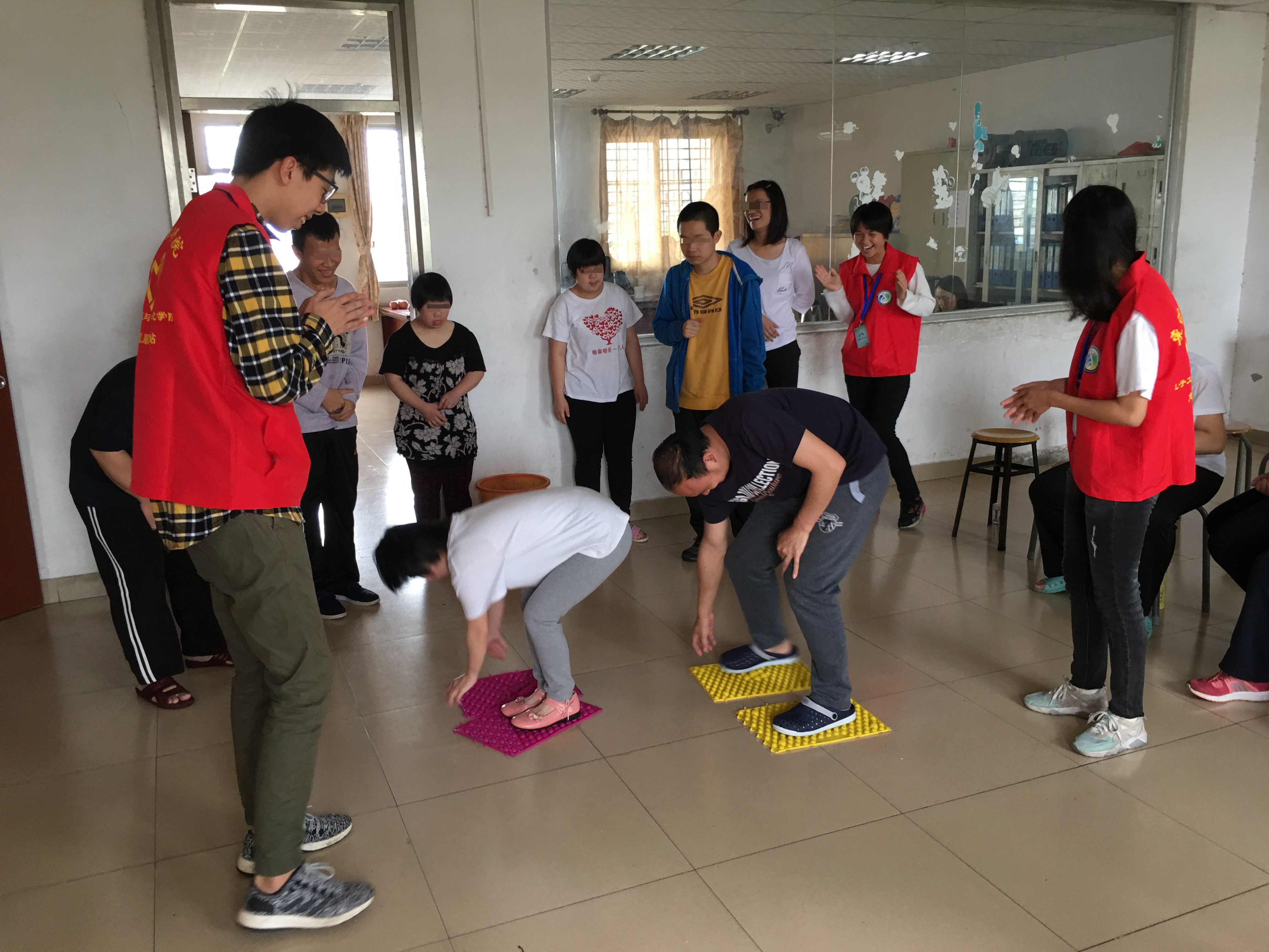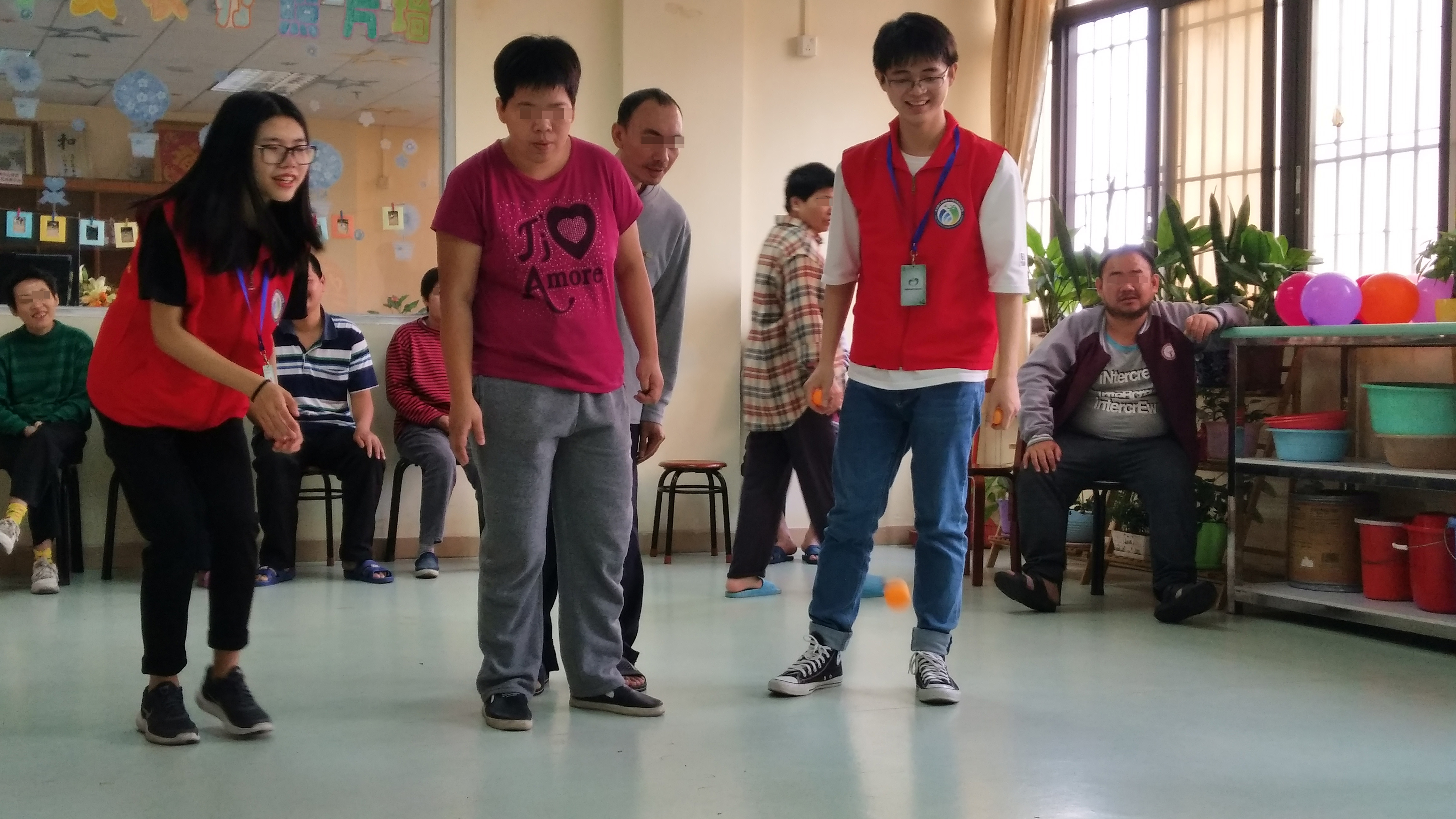 在智障部、精障部、多障部,我们都进行了各种游戏,例如:“摇摆箱子”,“踢气球过障碍”,“过河拆桥”等。在精障组的第一个环节是拍气球。这个环节又分为两个小游戏,一个是热身游戏,另一个则是激烈的大游戏。第二个环节是听声辨瓶。第三个环节是游戏眼花缭乱。最后一个环节就是才艺表演。在游戏期间,志愿者们和学员们相处融洽,在整个玩的过程中都十分享受。在中途的表演中,学员也展示自己的风采给志愿者们看,志愿者们也以唱歌来作为回礼。