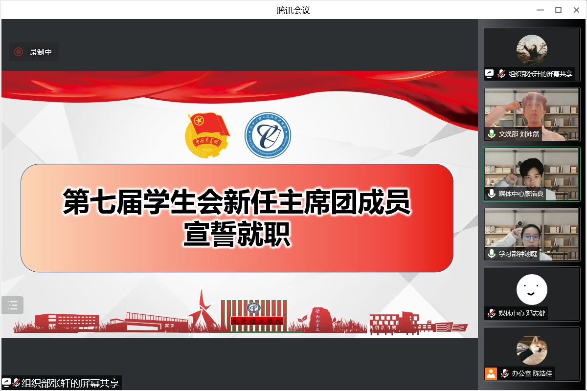 化能学院廖浩良、刘沛然、钟翊庭、黎浩琛、王杰五位候选人依次发表竞选演讲。最终,廖浩良、刘沛然、钟翊庭三名同学高票数通过,当选为学生会新晋主席团成员并宣誓就职。