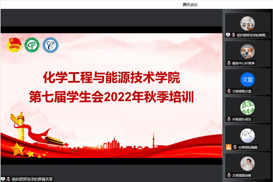 为学习贯彻习近平总书记关于青年工作的重要思想内容,根据全国学联、广东学联关于学生会工作要求,严格落实学生会工作人员培训制度,加强从严治会,强化思想引领作用。2022年10月18日晚,化学工程与能源技术学院团委、学生会通过腾讯会议于线上召开2022年秋季学生会干部培训会。政治辅导员王馨、青年创新创业服务中心副主任姚奕群、第七届团学部门负责人和2022级学生工作人员出席本次会议。