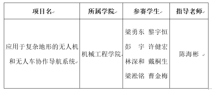 根据团省委的工作要求及项目分配名额安排,结合我校参加2019年“挑战杯”广东大学生课外学术科技作品竞赛决赛的结果及校外专家的推荐意见,现决定推报机械工程学院《应用于复杂地形的无人机和无人车协作导航系统》项目参加2019年第十六届“挑战杯”全国大学生课外学术科技作品竞赛。