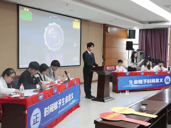 复赛第一场,化学工程与能源技术辩论代表队与工程师学院(创新创业学院)&电信工程与智能化学院辩论代表队就“时间赋予生命意义/生命赋予时间意义”这一辩题展开辩论。双方辩手言之凿凿,论之有理。正方一辩率先开题,首先从时间的定义出发切入题目;反方关于生命赋予的过程方法对正方进行切磋。双方辩手对于辩题的理解独特,各有自己的论证,场面难解难分,各位辩手积极响应辩驳,体现了良好的辩论姿态。
