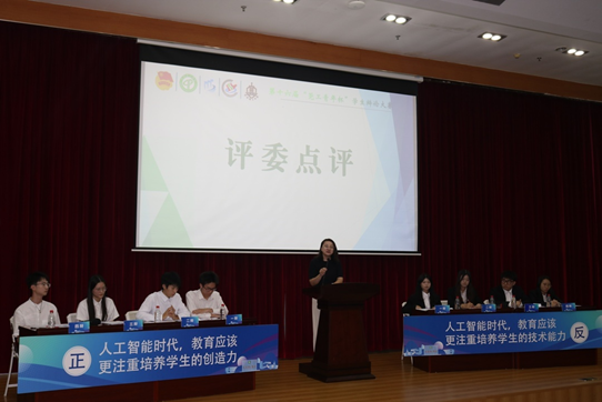 点评环节,评委张亦康老师赞扬了双方辩手,也针对双方辩手有待改善的地方提出了想法,张亦康老师从自身经历回忆辩论的感情,并讲述了随着技术的发展,辩论技巧也发生了变化,现在更注重逻辑论据的准备和攻防策略的运用,而非简单的信息背诵。同时,对技术中立性的反思也日益重要,提醒我们在享受社交媒体便利的同时,也应关注其潜在风险,促进健康、理性和负责任的社交媒体使用。