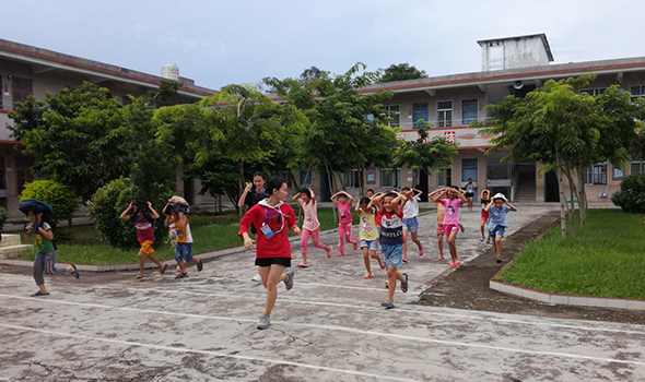 下午两点,各班班主任进行了地震自救教学知识的传授,学生们非常认真地学习。三点时,学校教学楼准时发出地震信号,全校师生按照防震演练预案要求,沉着冷静,井然有序地利用课桌和书包等进行自护。支教队在此次防震演练活动中做了充足的准备,在整个演练活动中,每个班安排了两名教师跟班,楼梯道也有两名教师指挥演练现场,维护秩序,防止意外发生。在教师们的指挥下,学生们双手抱头,从教学楼快速撤离跑向操场集合。演练活动共进行了三次,在师生们的共同努力下,逃生时间从第一次的50秒到30秒再到14秒,达到了理想的预期效果,演练活动顺利完成。此外,何志森校长也到达现场指导演练活动。