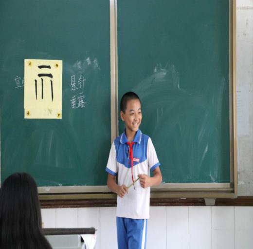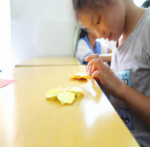 上午,书香飘散,支教队员王于潼用毛笔书写了她的耐心,即使学生们没有书法基础,但她依然孜孜不倦。每一笔,每一画,都是一份执着,对支教这项活动的执着。同学们也认真地学习着。手工课上,支教队员蔡秀榕用彩色卡纸与同学们一齐创造出漂亮的花朵。那各式各样的折纸,是同学们的创造力。