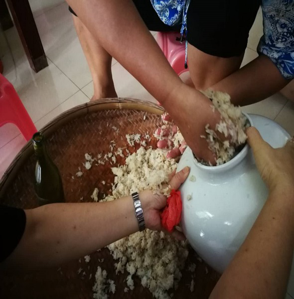糯米熟了并下降到一定温度后,在队员们的帮忙下,师傅熟练地完成了混合酒曲和糯米等一系列操作。最后将糯米装进酒缸,仔细用布将其封口并放置到阴凉处。