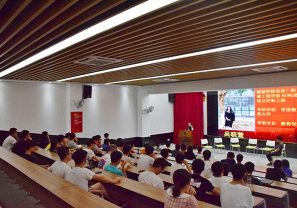 2019年5月25日下午,机械工程学院于松山湖校区学生中心A109举行2019届考研、考公经验分享交流会,参与人员有机械工程学院党总支副书记陈举铭,辅导员黄楚刁、罗嘉楠,分享人王俊超、吴晓萱、罗绍根、赖文杰、钟舒婷、周梓炎、魏玉宇及参与学生约60人,交流会由孙泽龙主持。