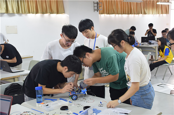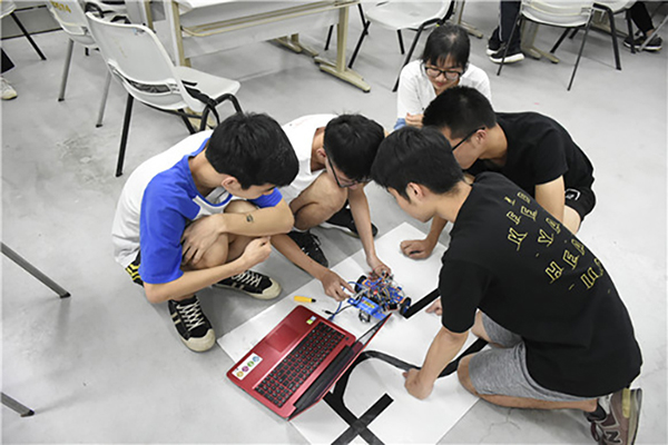 比赛开始,各队伍都有着明确的分工,有人负责拼装小车,有人负责编写程序,高效有序地合作着。本场比赛需要选手们在小车上加入灰度传感器和超声波探测器,分别用于通过比赛第二阶段的巡线路段和避障路段,这使拼装小车的过程增加了难度。选手们需要通过不断地下地试跑和调试,才能让小车平稳地按照赛道的轨迹前进,这也使得选手们需要花费大量的时间在调整和修改数据上。距比赛开始两个小时后,才陆续地开始有小组前往挑战最终赛道。但由于本次比赛难度较大,许多小组的小车都未能通过全部赛段,少数队伍表现优异,成功通过全部赛段,完成比赛。