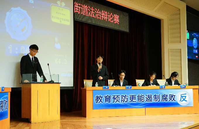 辩论赛开始前,东城街道办的领导周日佳对本场辩论赛致辞。在引人深思的小品《贿赂》的演出后,东城街道法治辩论赛正式开始。双方就“严刑重典还是教育预防更能遏制腐败”展开辩论。双方选手在立论陈词的环节中思路清晰,引经据典,字字珠玑,使现场气氛迅速升温。在自由辩论环节中,双方辩手就辩题展开更深层次的辩论,将比赛推向高潮。总结陈词环节正反双方紧紧围绕主题展开总结,让在场观众们一度感受到辩论的魅力以及言语的艺术性。在评委离场评议的时间里,会场同步播放习近平报道集之法治的力量的视频以及分局制作的微视频——宪法修改。评委代表郑玉敏教授对本次辩论赛进行点评,表达“抑制腐败不仅要做到不想腐和不敢腐,更要做到不能腐”的看法,并且表扬双方队伍的优秀之处。本次辩论赛正方队伍获得胜利,李雨洙同学获得最佳辩手奖,邓卓立同学获得最佳风采奖。至此,本场辩论赛圆满结束。